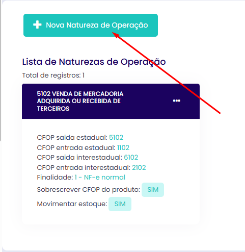 - Na tela de Naturezas de Operação, clique em Nova Natureza de Operação