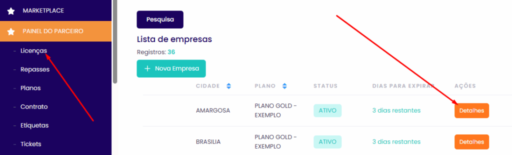 2 - Localize a licença desejada utilizando os filtros e clique em Detalhes (canto direito)
