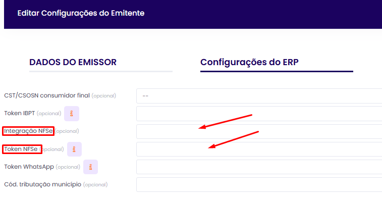 - O TOKEN precisa ser solicitado diretamente ao integrador Integra Notas ou contratado através do suporte do ERP.