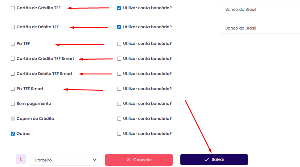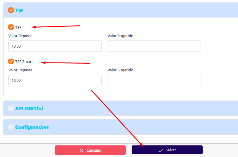- E marque as opções correspondentes às formas de pagamento TEF.
