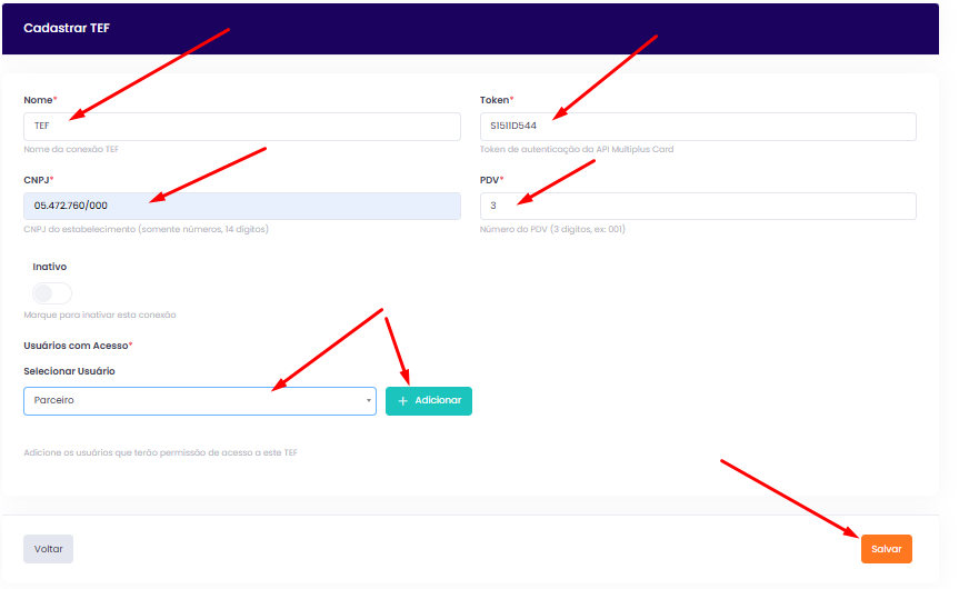 - Em seguida, aplique as informações de integração na tela do sistema, conforme modelo exibido abaixo: