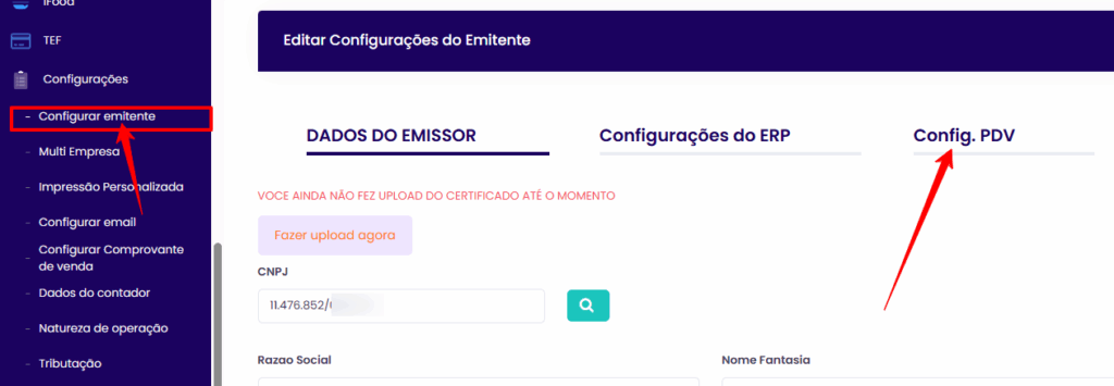 - Caminho: menu Lateral ➜ Configurações ➜ Configurar Emitente